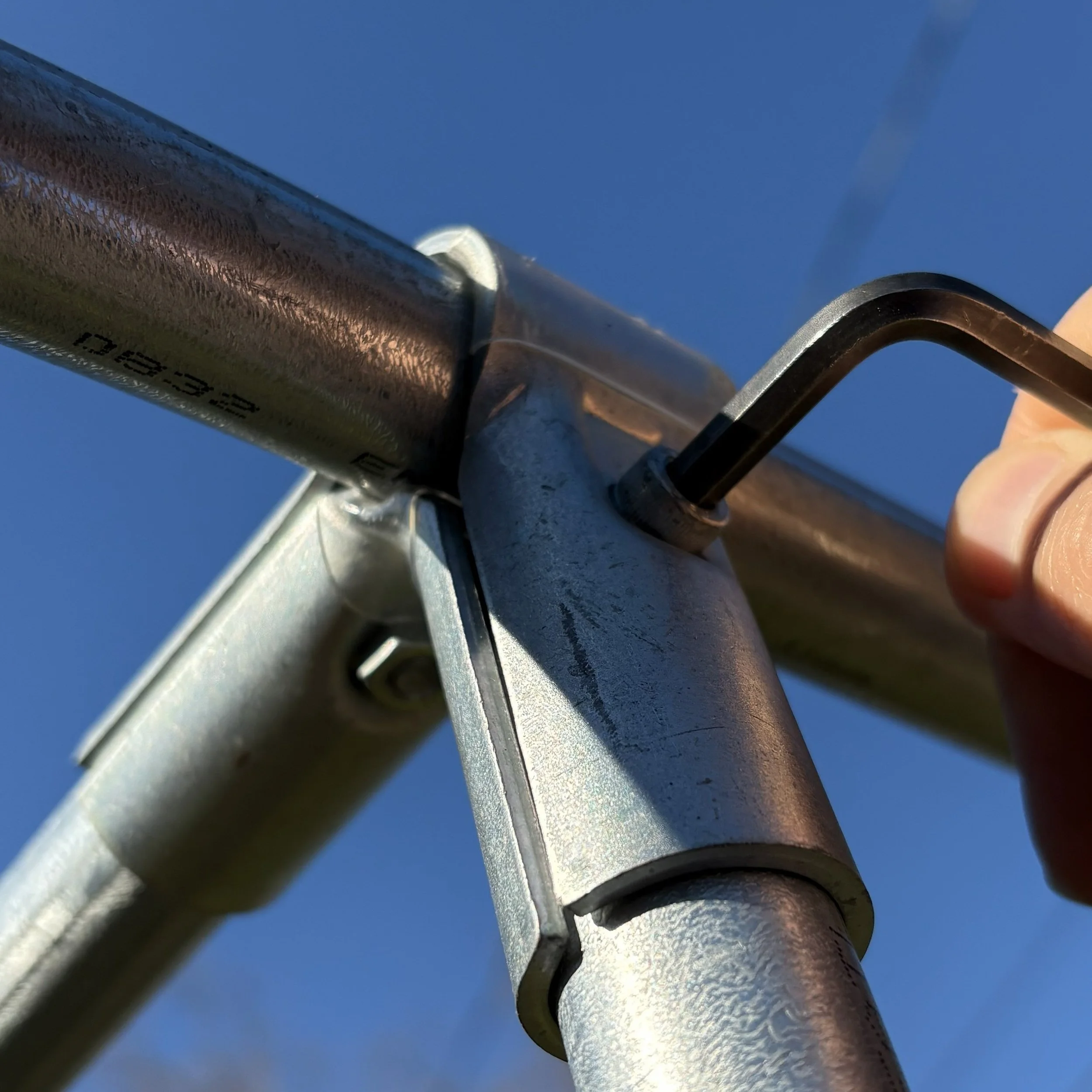 The horizontal EMT lengths were added to the EMT legs with 90 Degree Structural Pipe Connectors. The connectors were placed loosely at first, then they were tightly secured with the hex tool once the trellis was leveled.