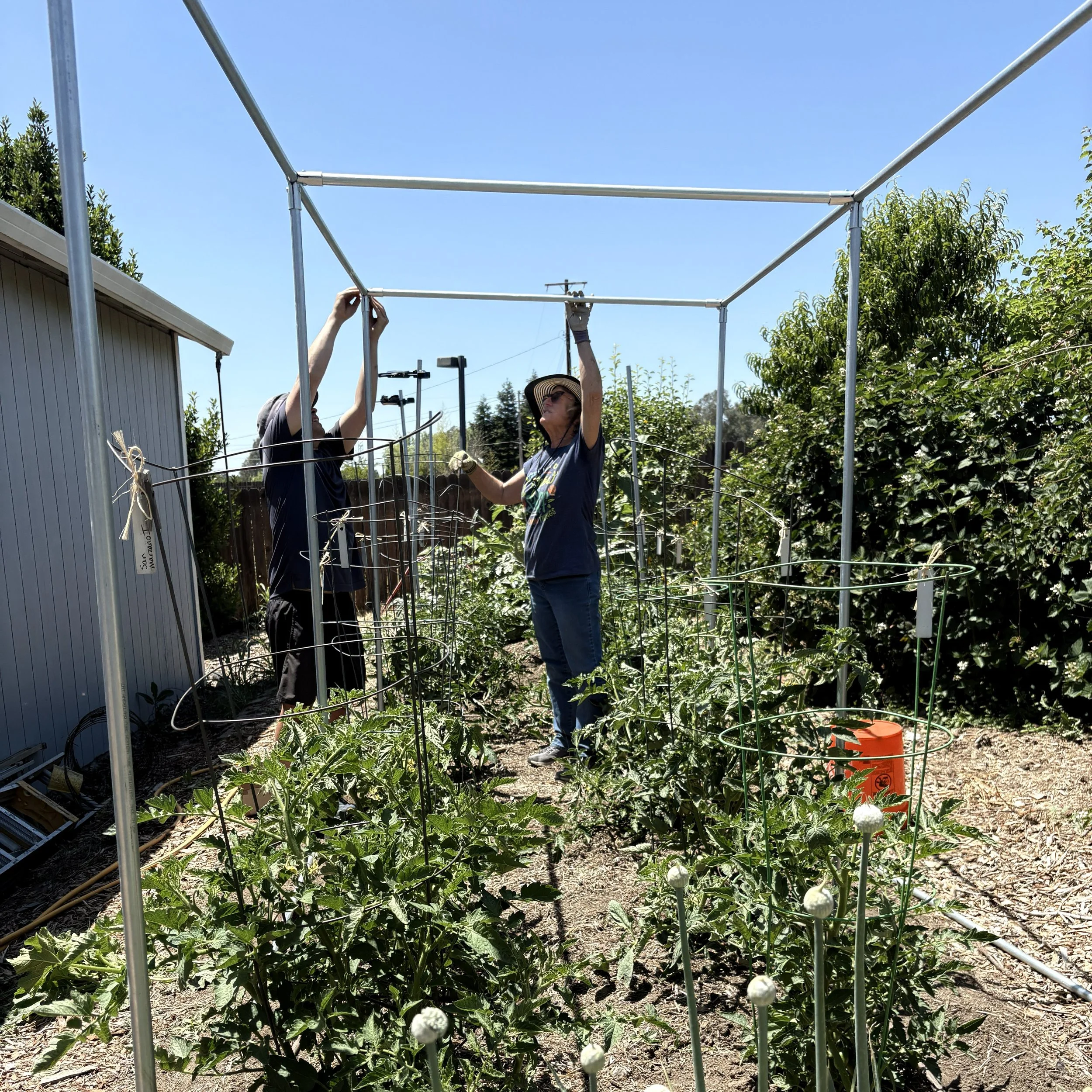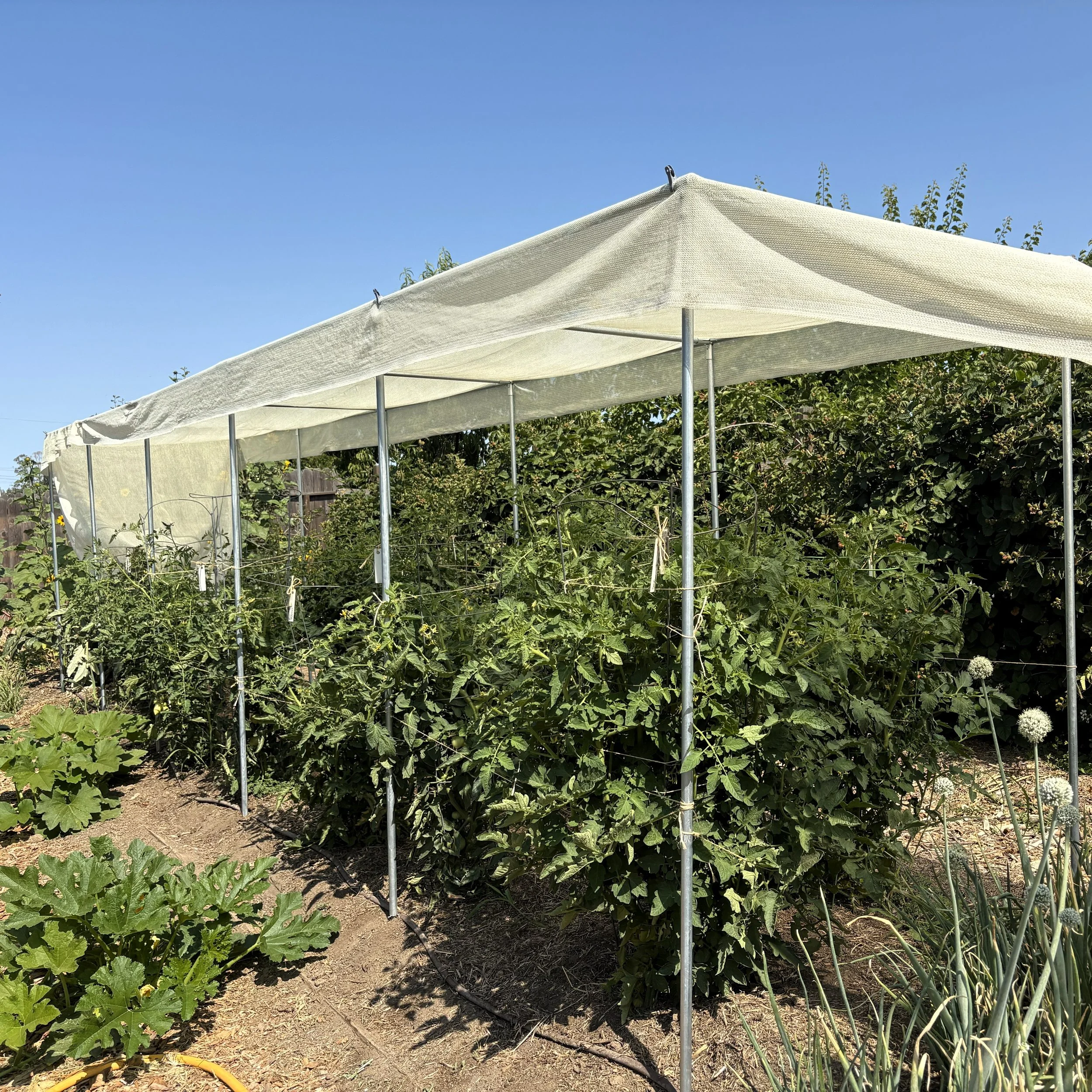 In June 2025, this trellis was being used to support and shade tomato plants.